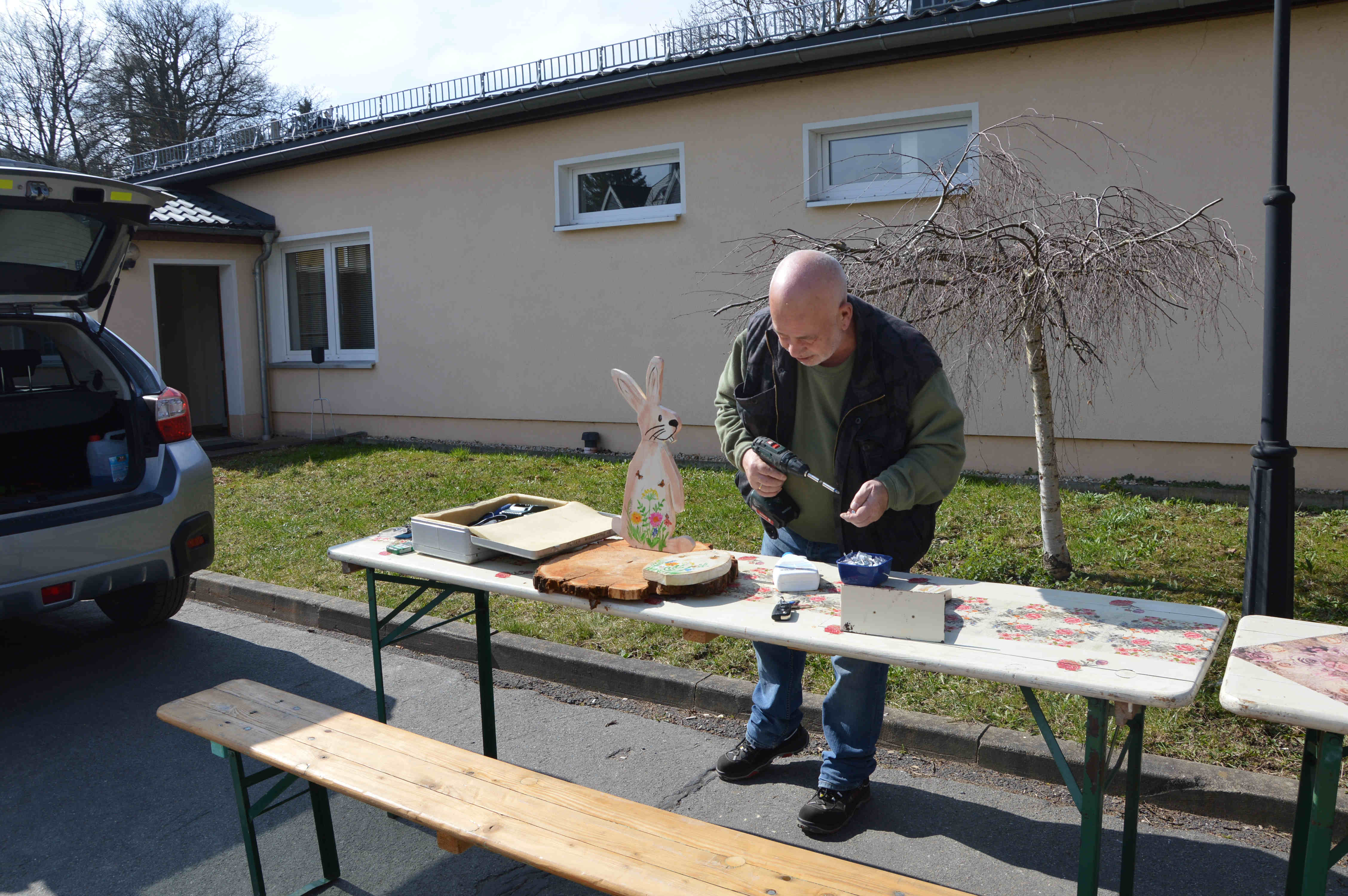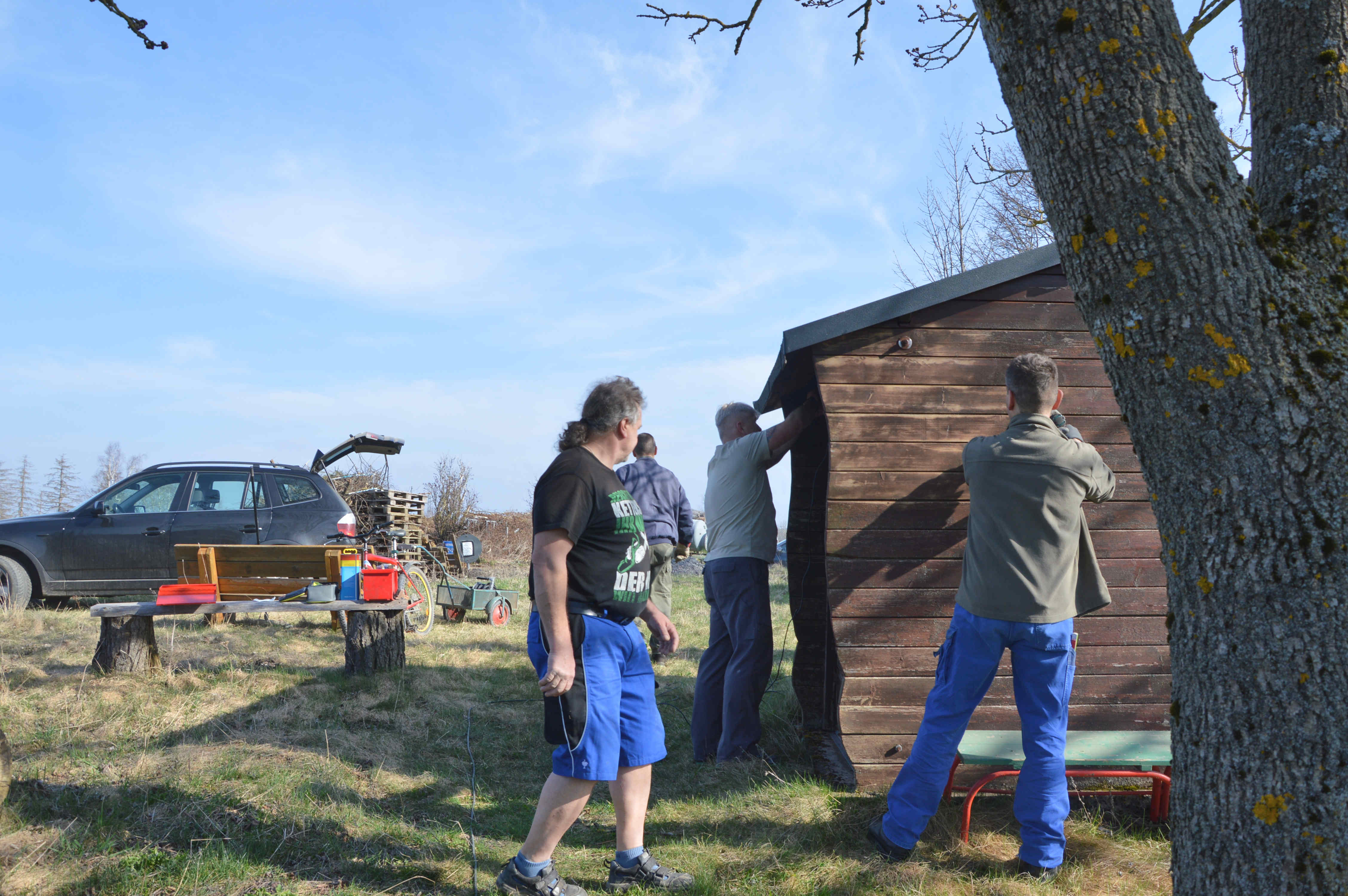 Was im Großen und Ganzen wohl so ablief, dass sich jeder heraussuchen konnte, zu welcher Aufgabe er sich mehr hingezogen fühlte. Dabei waren ganze 3 Projekte vorgesehen. Ein Schrank im Lagerraum des Vereinshauses war zu reparieren, die Schutzhütte am Lagerfeuerplatz sollte einen neuen Anstrich bekommen und natürlich die Osterkrone geflochten werden. Als Spezialaufträge nebenher galten das Besorgen und die Zubereitung des Mittagessens.