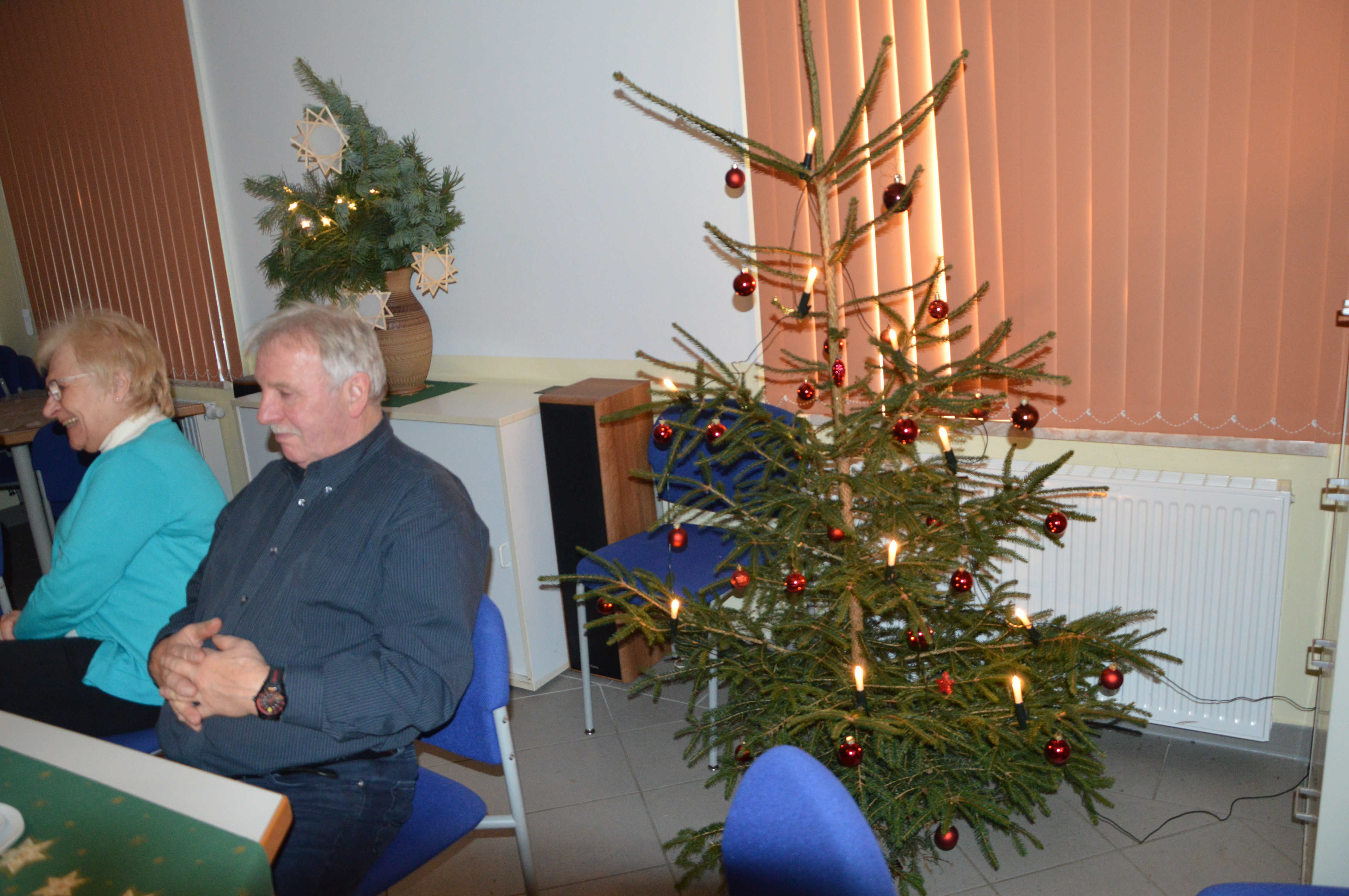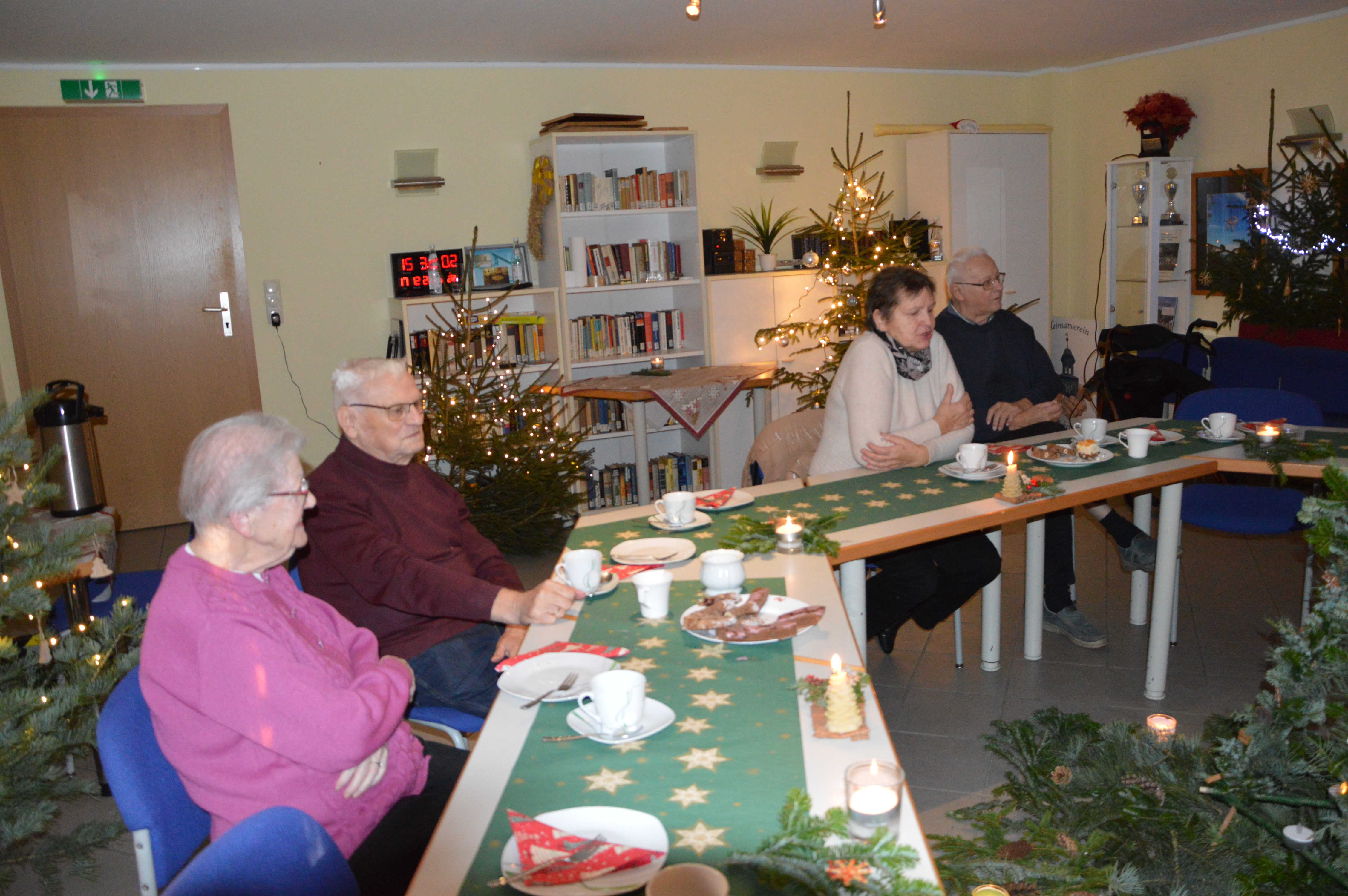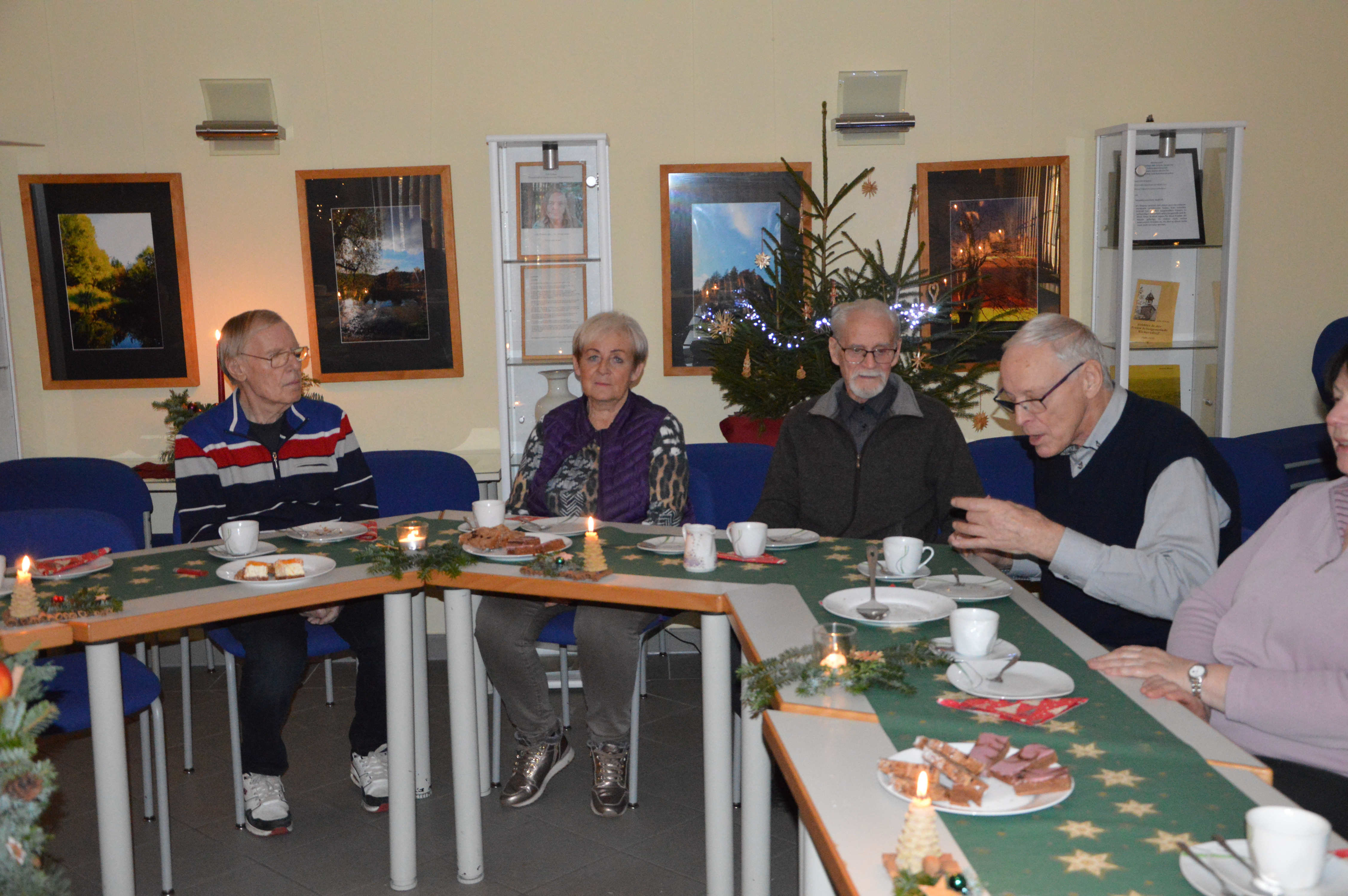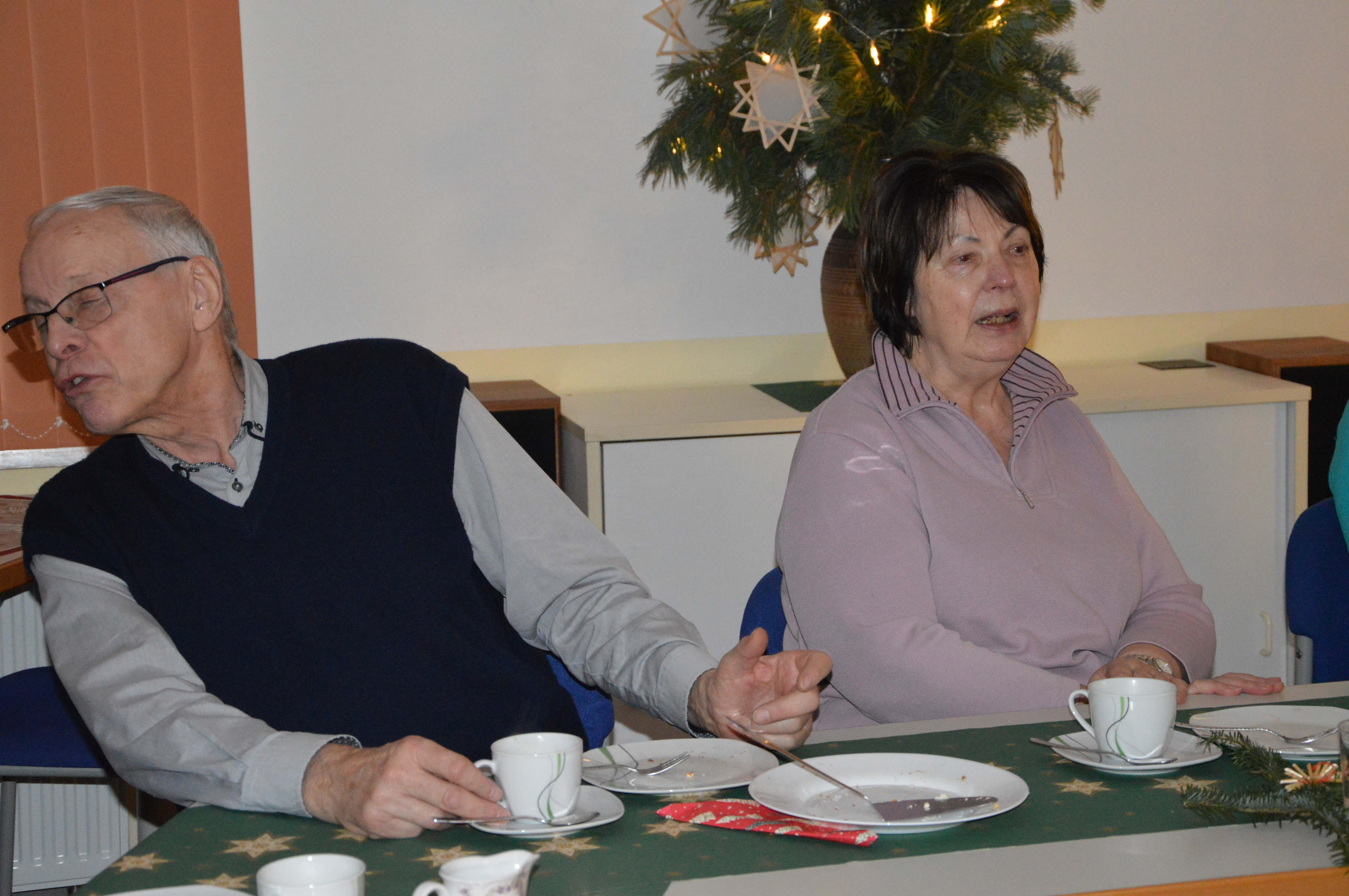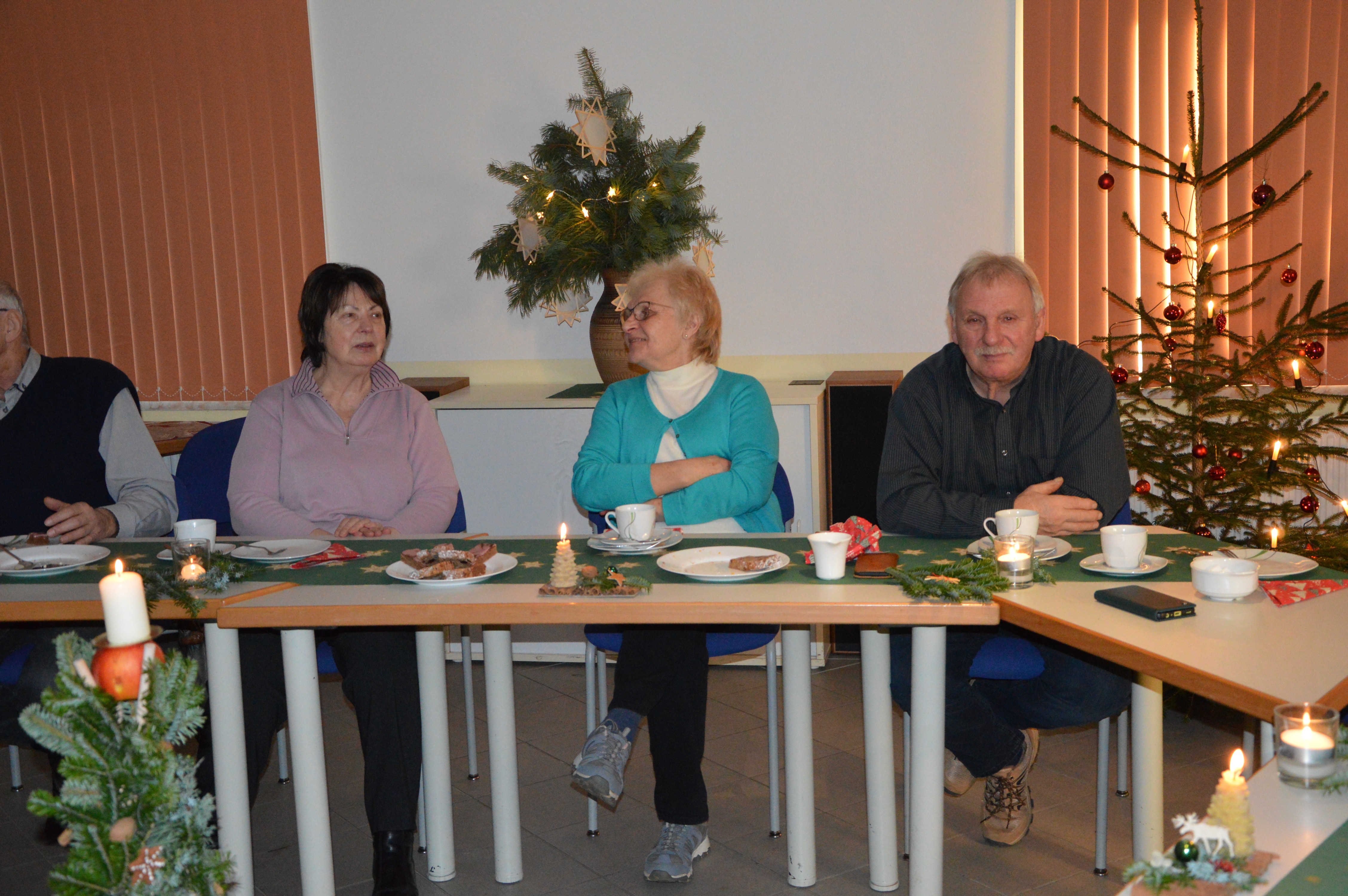 Um Platzmangel zu vermeiden, hatten die Organisatoren 2 Tafeln nebeneinander eingerichtet. Diese waren bereits für ein Kaffeekränzchen sauber gedeckt und mit weihnachtlichem Gebäck versorgt. Und am Ende waren auch beide gut besetzt. Mit einer kurzen, aber freundlichen Begrüßung eröffnete Sylvia Harbich die Veranstaltung. Danach übergab sie die Moderation an Uli Meier, der mit Hilfe einiger Bewohner der LG und Ricarda Rau am Klavier die anwesenden Gäste zum Singen einiger Weihnachtslieder animierte. Ein fernsehreifer Auftritt gelang uns dabei sicherlich nicht, aber ich finde, es klappte doch recht gut. Damit waren wir alten Leute dann auch soweit, den frisch servierten Kaffee mitsamt dem vorhandenen Gebäck zu genießen. Mit einer ganz interessanten Präsentation über seine erst kürzlich absolvierte Reise durch Peru ergänzte Uli Meier noch das Programm. Insgesamt würde ich einschätzen, bekamen wir mit dieser Veranstaltung einen durchaus angenehmen Aufenthalt und eine wirklich gemütliche Adventsfeier geboten. Deshalb möchte ich mich, und das sicher im Namen aller Teilnehmer, ganz herzlich für die uns gebotene, höfliche Gastfreundschaft bedanken.
