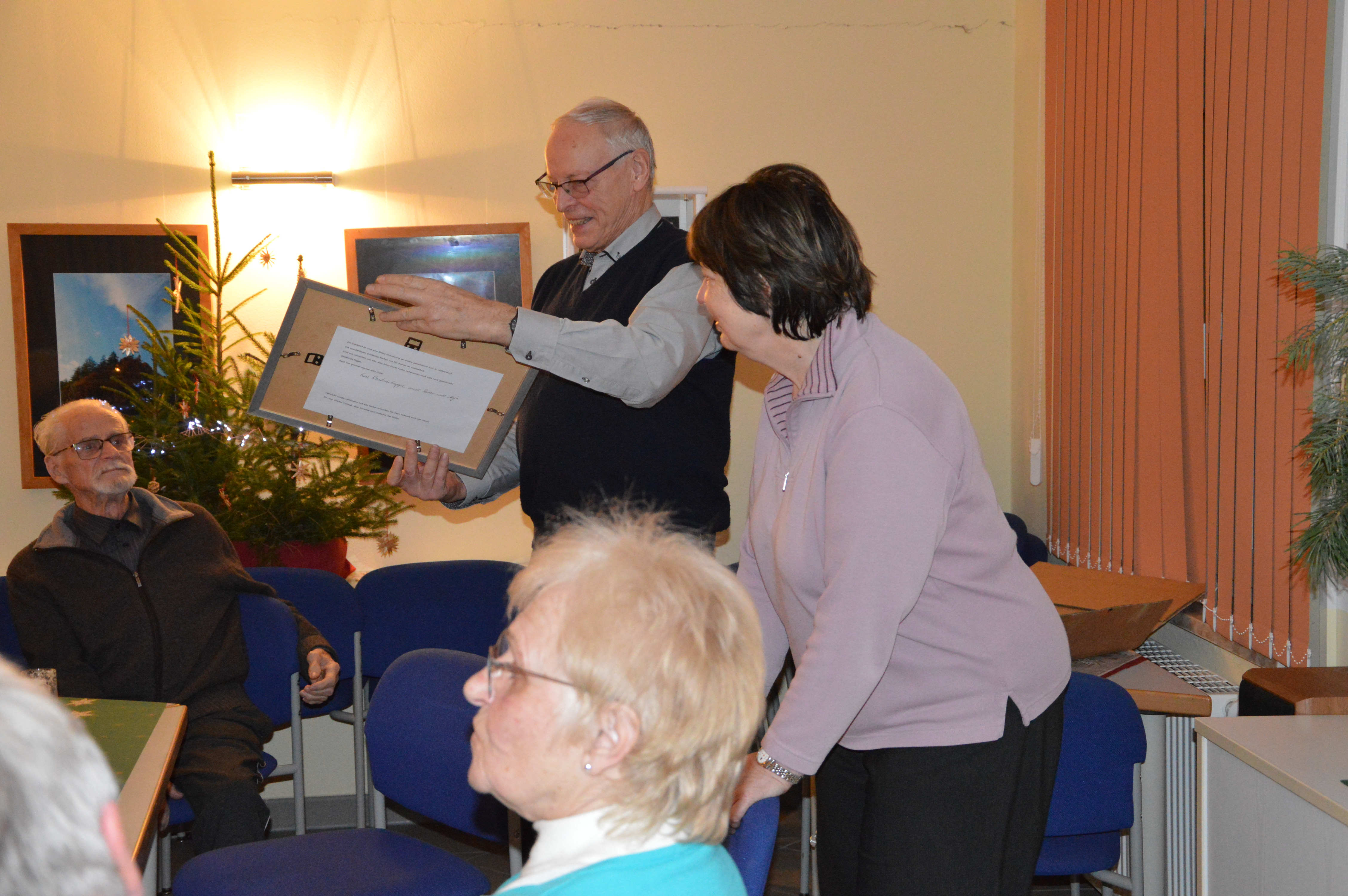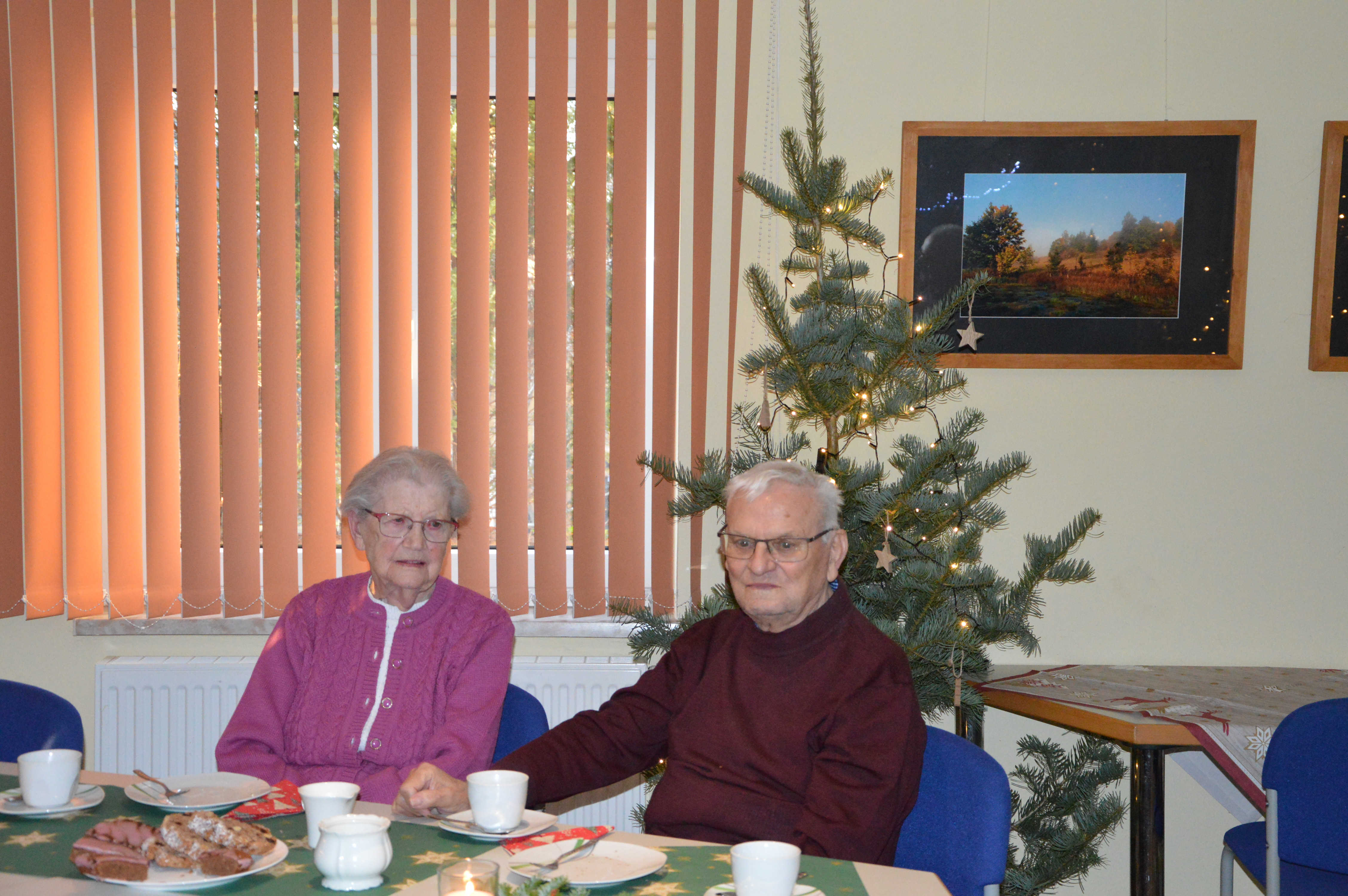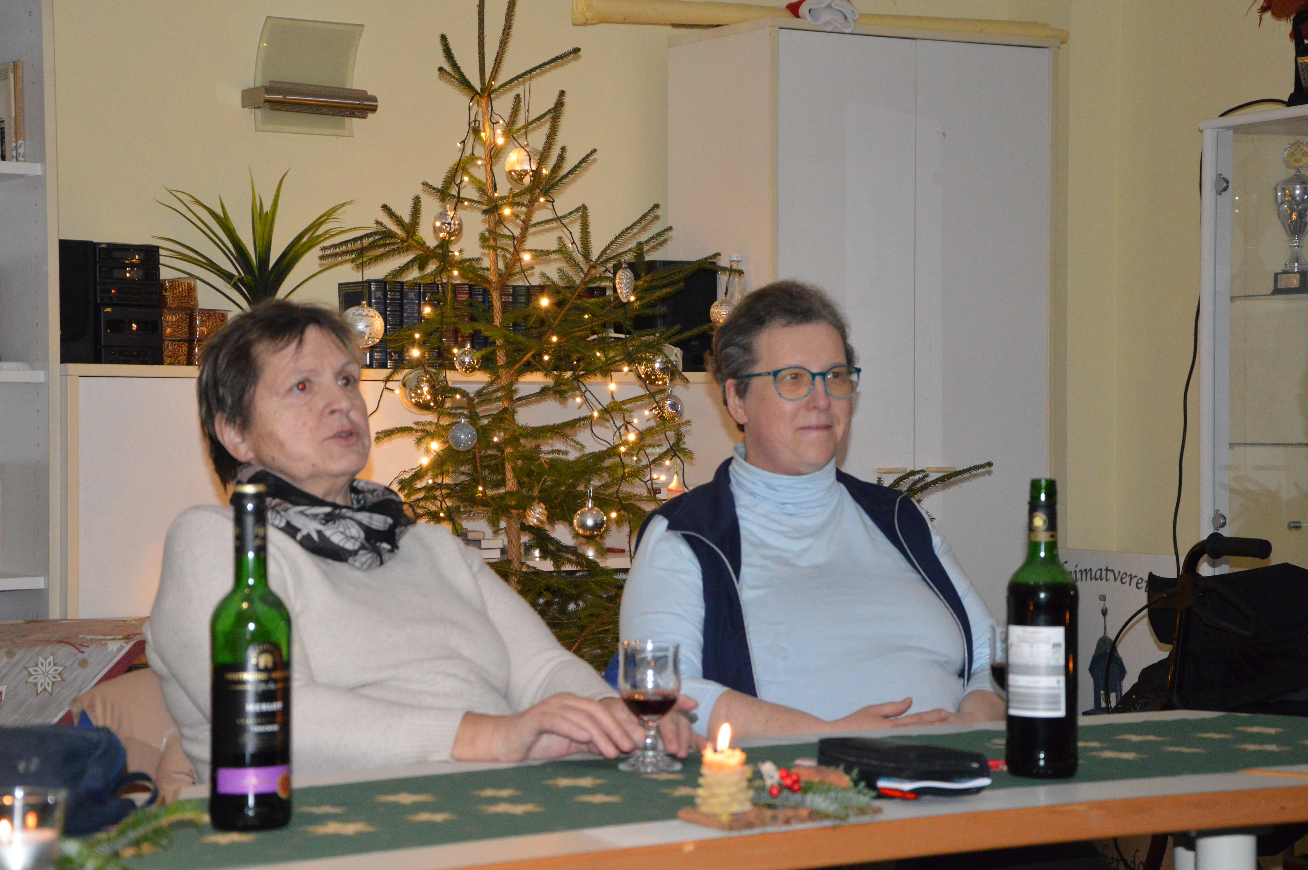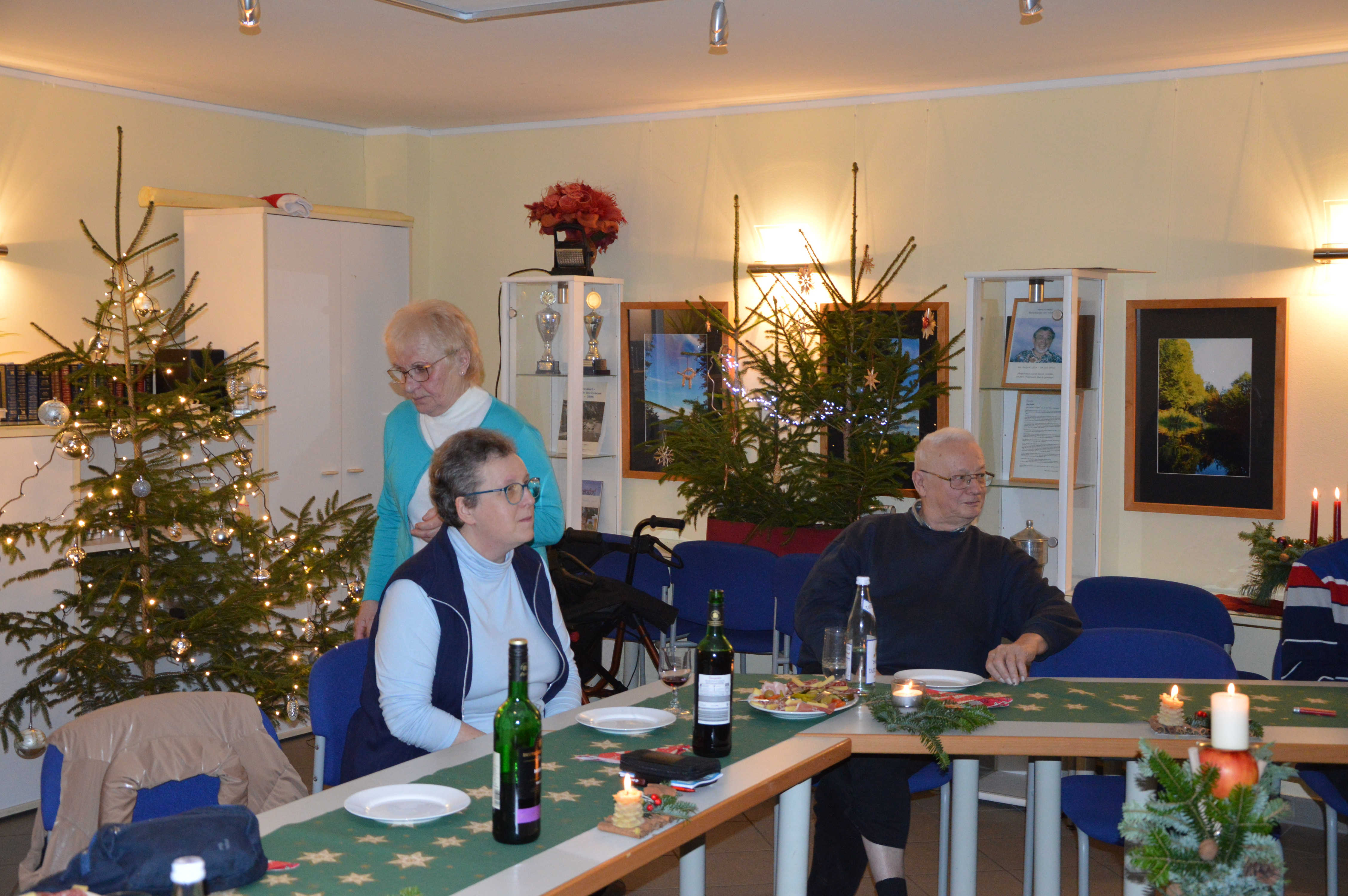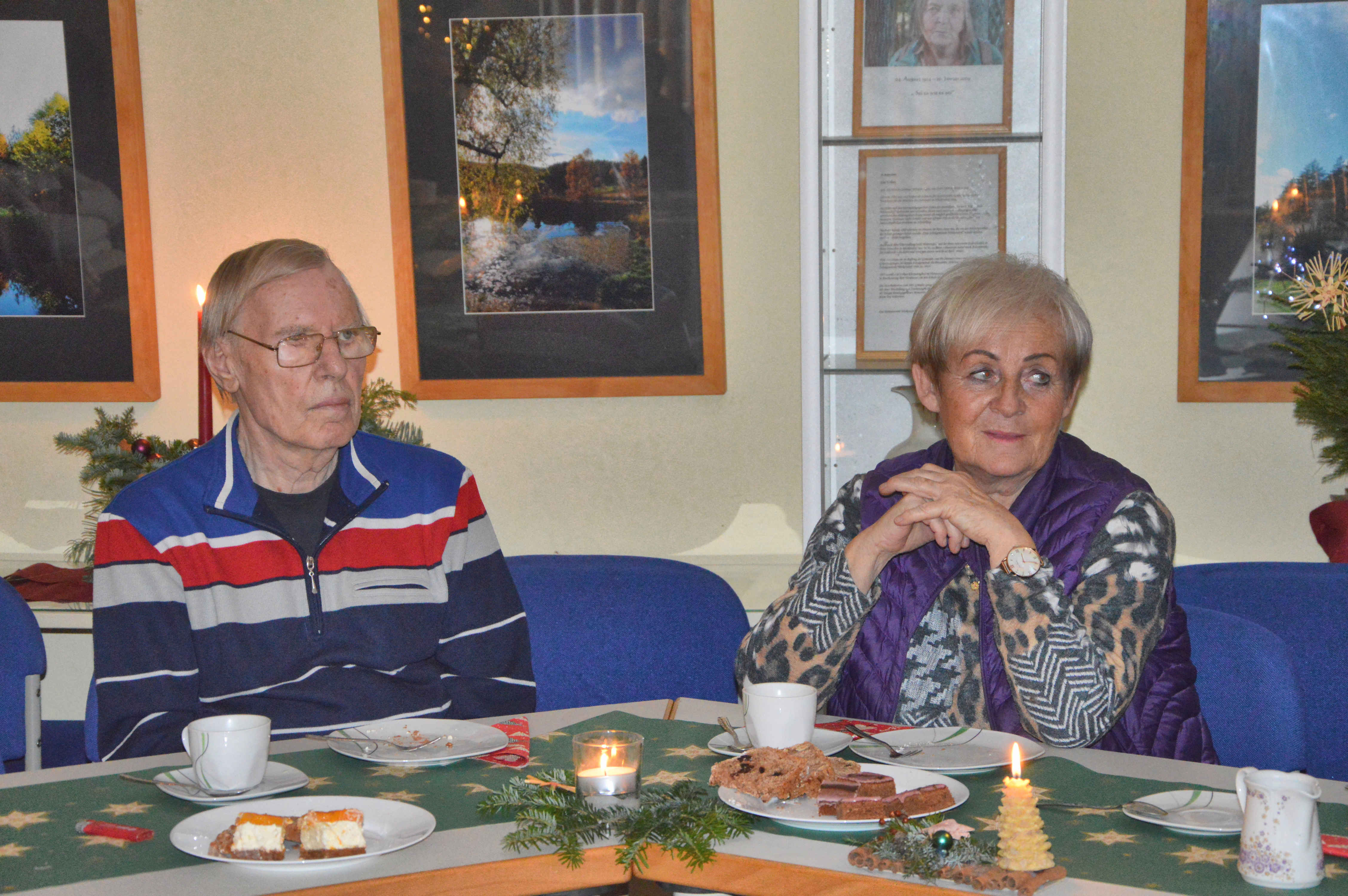 Um Platzmangel zu vermeiden, hatten die Organisatoren 2 Tafeln nebeneinander eingerichtet. Diese waren bereits für ein Kaffeekränzchen sauber gedeckt und mit weihnachtlichem Gebäck versorgt. Und am Ende waren auch beide gut besetzt. Mit einer kurzen, aber freundlichen Begrüßung eröffnete Sylvia Harbich die Veranstaltung. Danach übergab sie die Moderation an Uli Meier, der mit Hilfe einiger Bewohner der LG und Ricarda Rau am Klavier die anwesenden Gäste zum Singen einiger Weihnachtslieder animierte. Ein fernsehreifer Auftritt gelang uns dabei sicherlich nicht, aber ich finde, es klappte doch recht gut. Damit waren wir alten Leute dann auch soweit, den frisch servierten Kaffee mitsamt dem vorhandenen Gebäck zu genießen. Mit einer ganz interessanten Präsentation über seine erst kürzlich absolvierte Reise durch Peru ergänzte Uli Meier noch das Programm. Insgesamt würde ich einschätzen, bekamen wir mit dieser Veranstaltung einen durchaus angenehmen Aufenthalt und eine wirklich gemütliche Adventsfeier geboten. Deshalb möchte ich mich, und das sicher im Namen aller Teilnehmer, ganz herzlich für die uns gebotene, höfliche Gastfreundschaft bedanken.