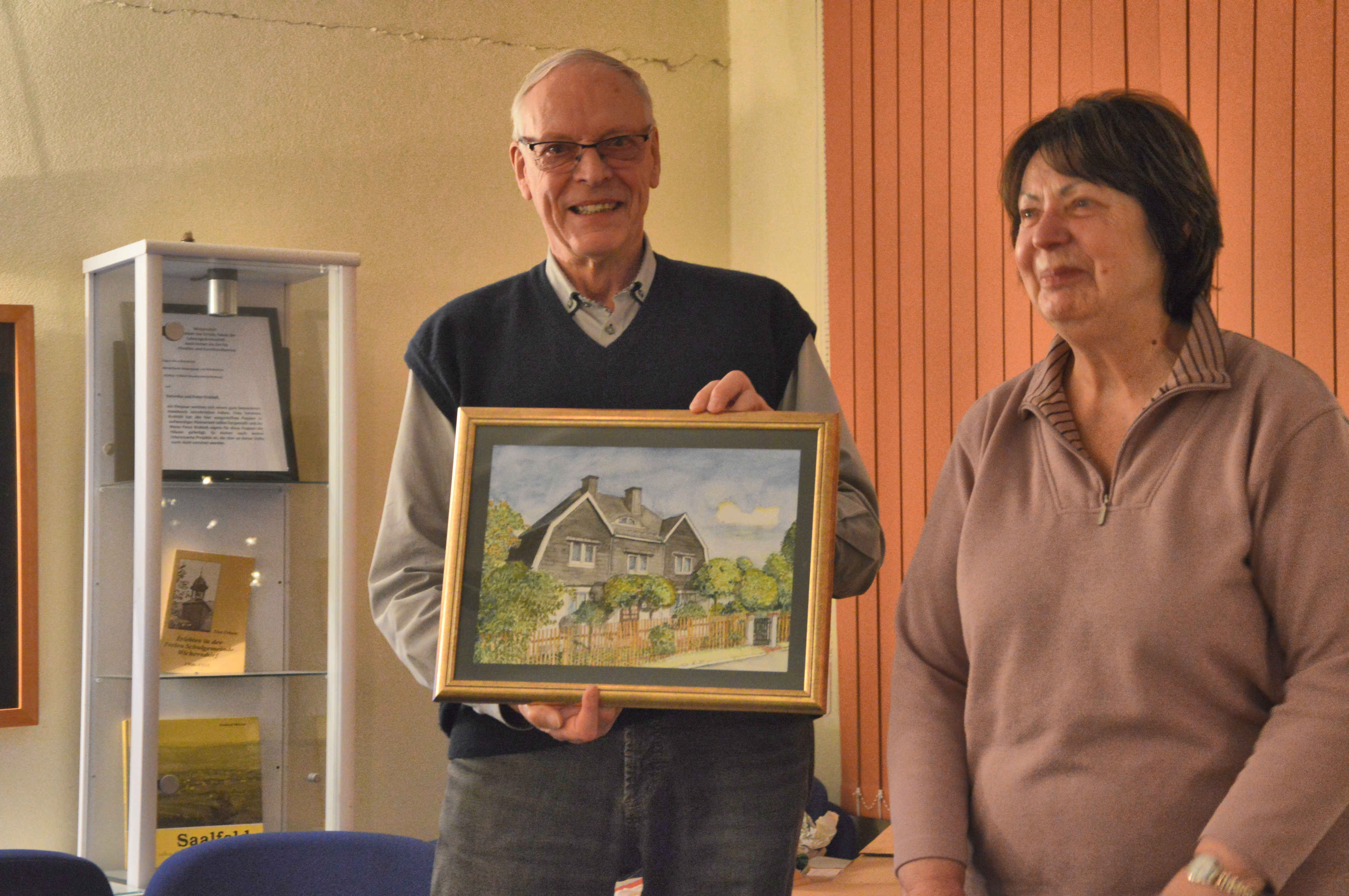Die Zubereitung des Abendessens musste aber schließlich vorübergehend unterbrochen werden. Ausgelöst durch das Erscheinen von Anja Rosenbusch, welche an diesem Tag ein wichtiges Anliegen vorzutragen hatte. Sie realisierte dies durch eine kurze Ansprache, in deren Folge sie ein Präsent überreichte. Das wiederum ließ das Leuchten in Gerhild und Uli Knopfs Augen noch heller strahlen. Ein Gemälde von Gerhild und Ulis ehemaligem Domizil, das sie sich nun, möglichst gut sichtbar, irgendwo in ihrer neuen Wohnung aufhängen können.