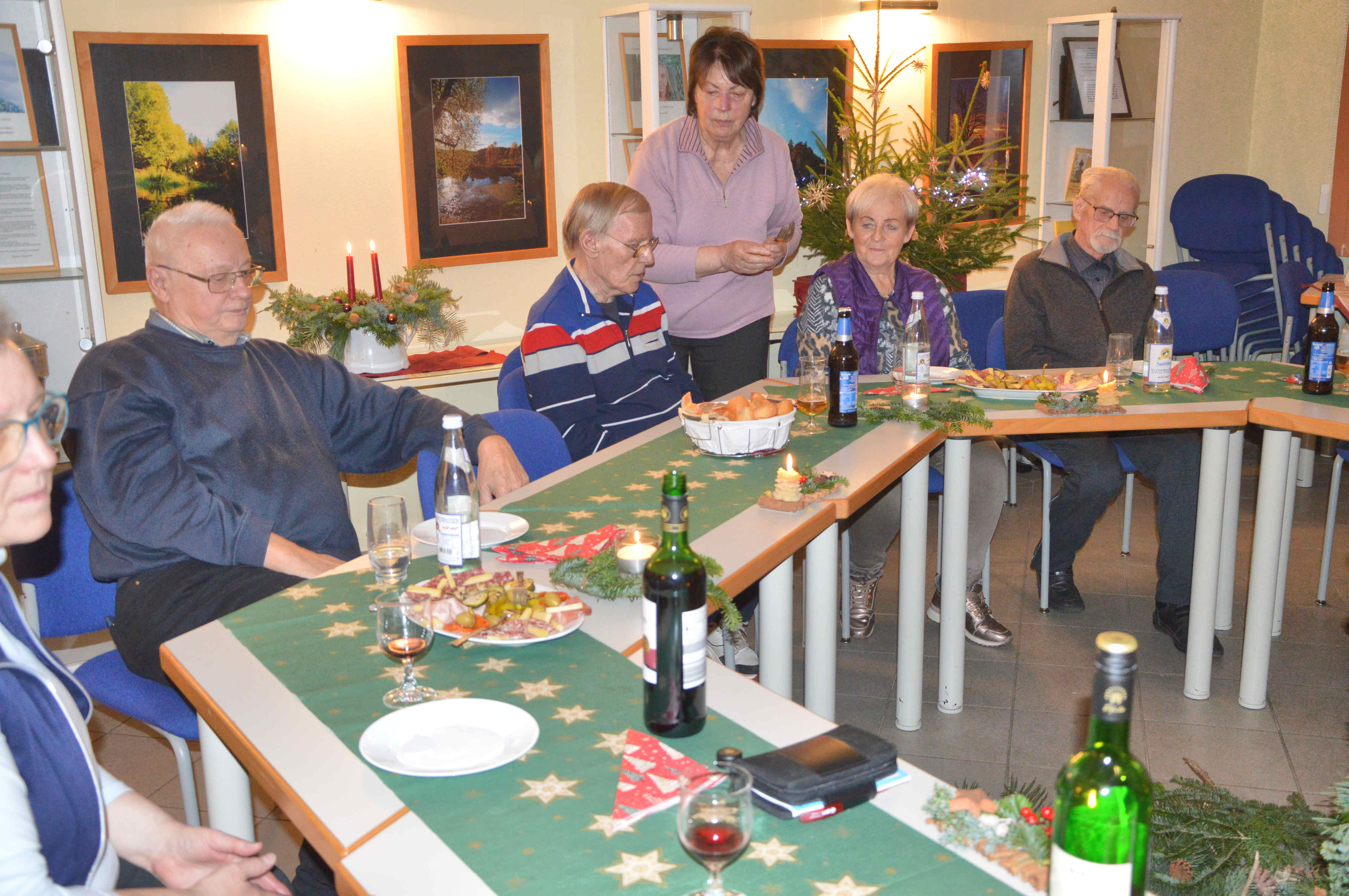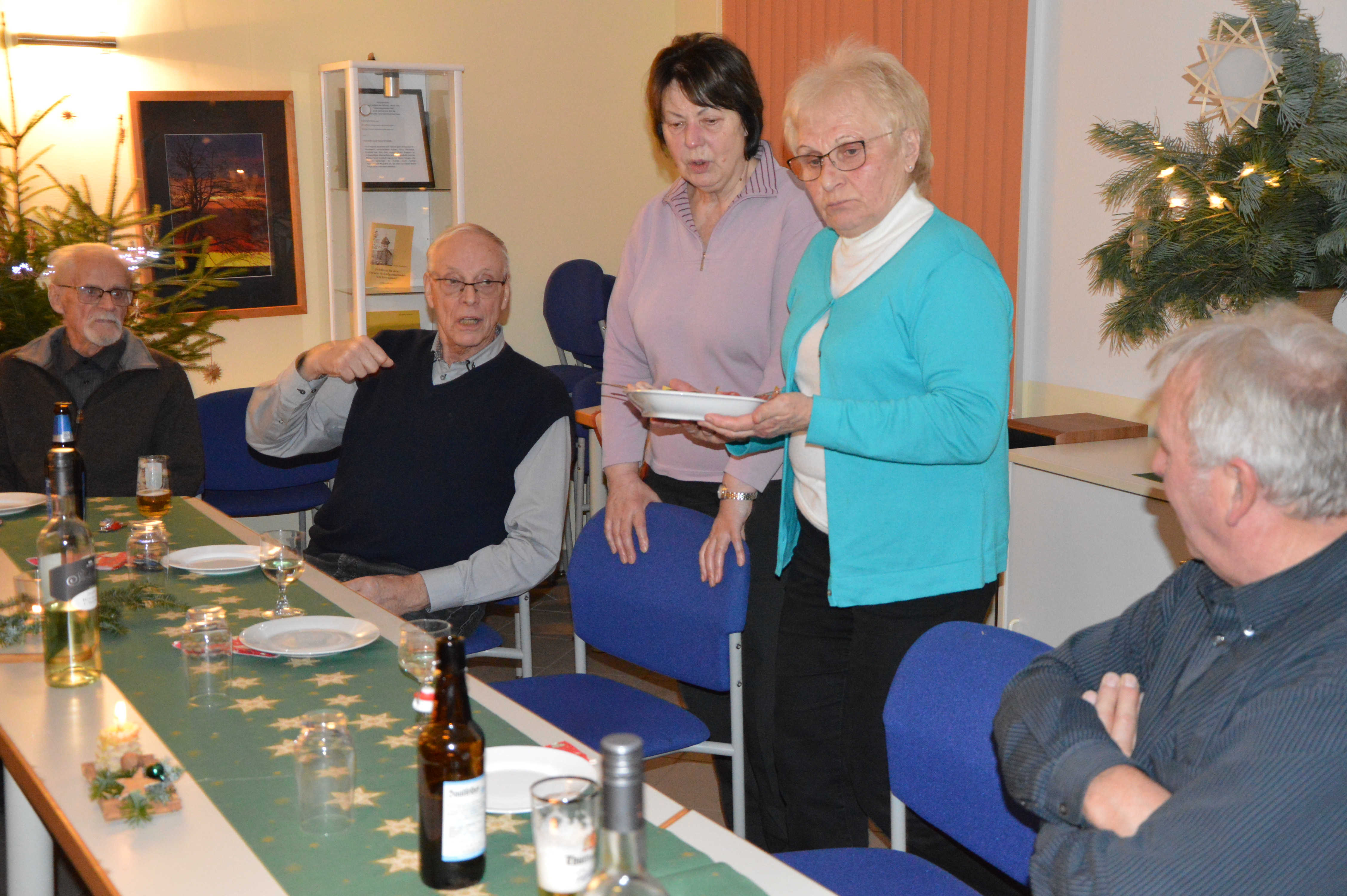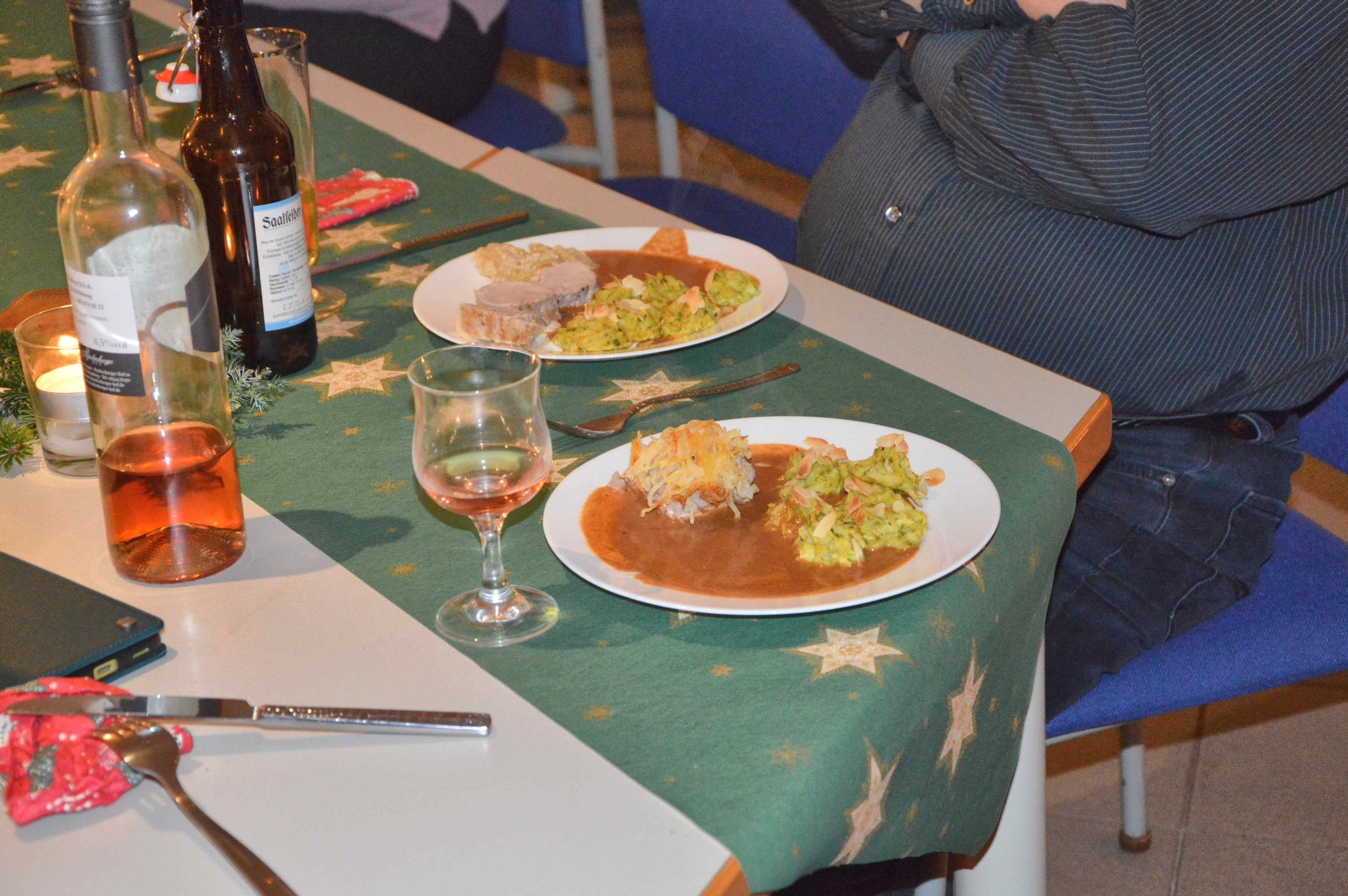 Wenn schließlich das Essen auf dem Tisch steht, wird es in der Regel aber wieder ruhiger. So passierte es auch diesmal. Wobei das eine oder andere Lob über die grandios gelungenen Speisen absolut berechtigt waren. Als echte Thüringer Küche konnte man die gebackenen Kartoffelbreizipfel wohl kaum bezeichnen. Ebenso den für Otto Normalverbraucher (wie zum Beispiel mich) recht außergewöhnlich hergestellten Braten. Am guten Geschmack mangelte es indessen nicht. Eine etwas ausgefallene Idee, aber durchaus professionell umgesetzt. Ein Schnäpschen zur besseren Verdauung rundete das Ganze am Ende noch ab. Insofern kann man wohl behaupten, diese Adventsfeier hatte es wiedermal in sich. Den emsigen Küchenfeen und, ihnen allen voran, unserer Ingrid deshalb an dieser Stelle noch ein herzliches Dankeschön.