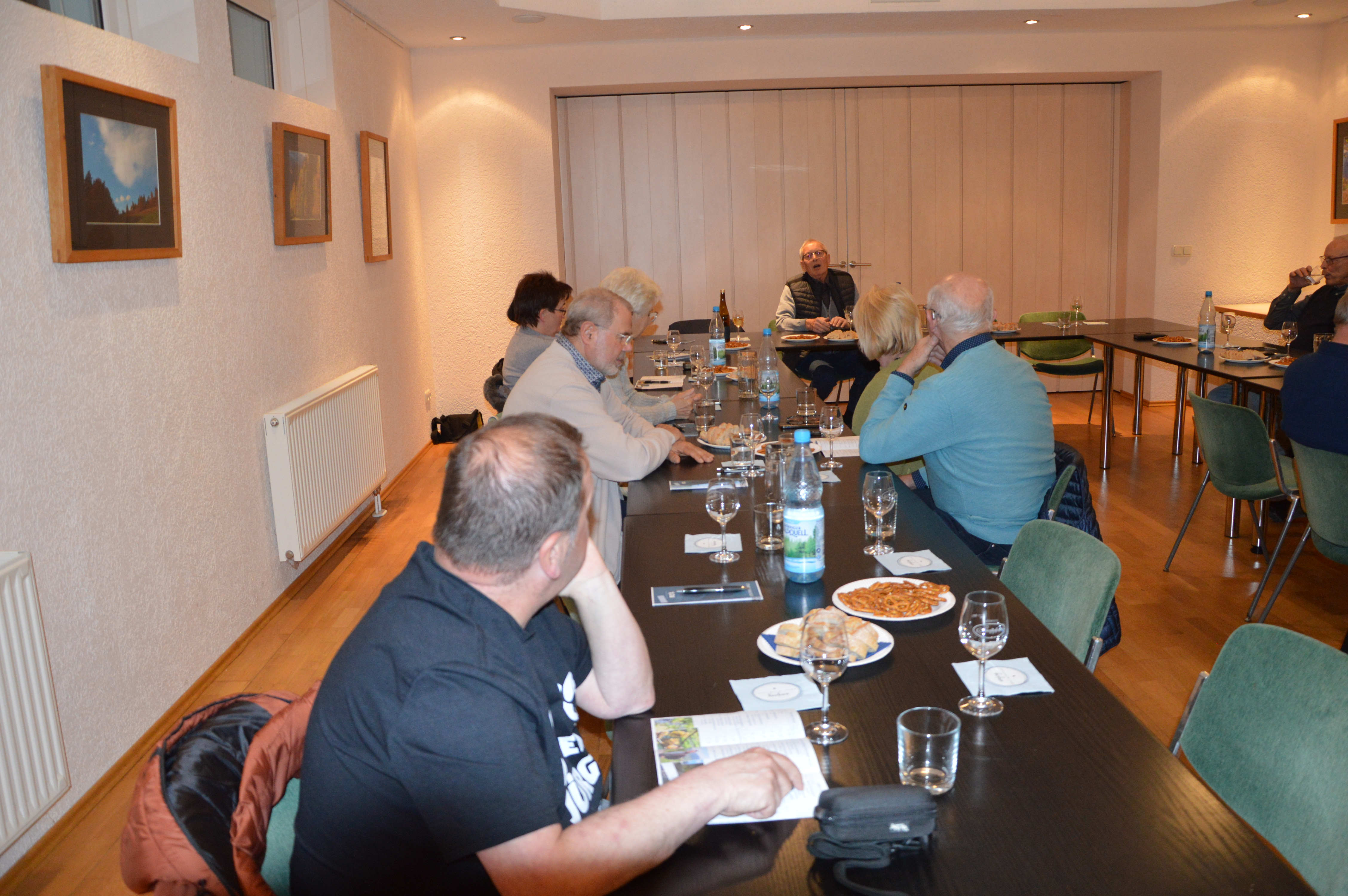 Immerhin kamen ja dann trotzdem 20 Gäste zusammen, womit Heinz und Karin absolut zufrieden waren. Wer einmal solch einen Vortrag hörte, weiß, warum man so etwas immer wieder gern mitmacht. Heinz‘ Berichte über die Arbeit der Winzer und ihrer Helfer werden nie langweilig. Das hängt natürlich auch damit zusammen, wie er es erzählt. Seine Wortwahl und Rhetorik machen das Zuhören zum Genuss. Sie machen die Härte der Arbeit am Steilhang, die Sorgen bei extremen Wetterverhältnissen oder die Freude über einen Wein, der bei einer Bewertung eine hohe Auszeichnung erhielt, regelrecht greifbar. Die Entstehung eines Weines vom Pflanzen des Rebstockes bis zum Abfüllen in die Flasche ist ein komplexer Vorgang vieler verschiedener ineinander verwobener Abläufe. Und natürlich sehr abhängig von vielen äußeren Umständen. Macht man an irgendeiner Stelle einen Fehler, wird es der Jahrgang dem Winzer nicht verzeihen. All diese Zusammenhänge bringt Heinz seinen Zuhörern nahe. Jahr für Jahr haben wir es gehört, aber jedes Jahr wieder auf eine eigene Art interessant und unterhaltsam.